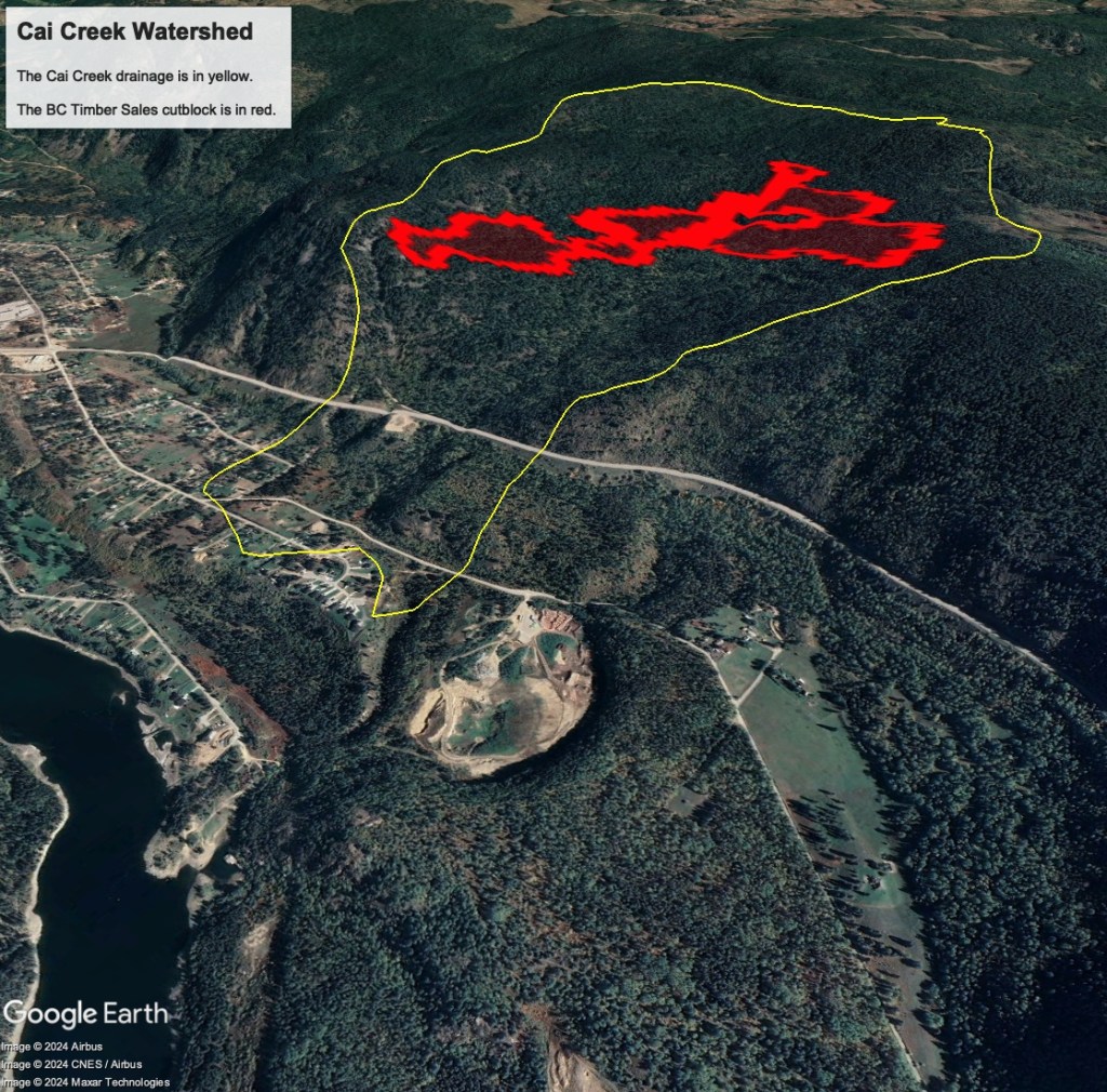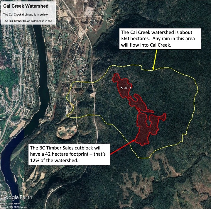 - Cutblock Area: The cutblock will have a footprint of 42 hectares with 6 hectares reserved. That’s about 10-15% of the Cai Creek watershed.