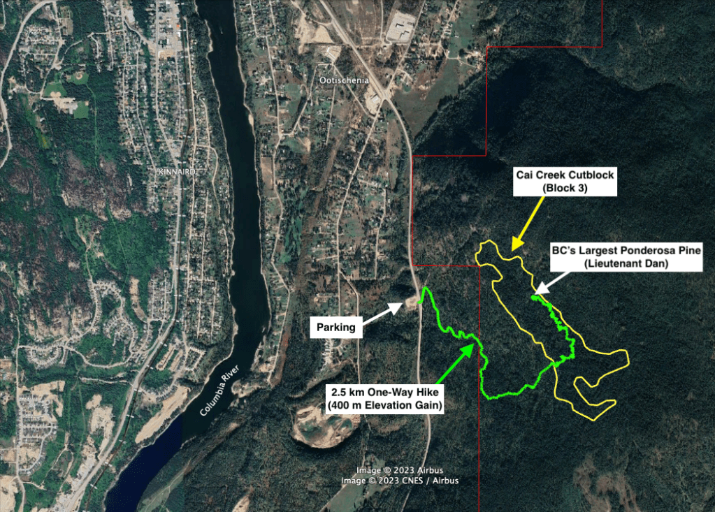 - After about 20-30 minutes you will arrive at Lieutenant Dan – BC’s largest Ponderosa Pine.